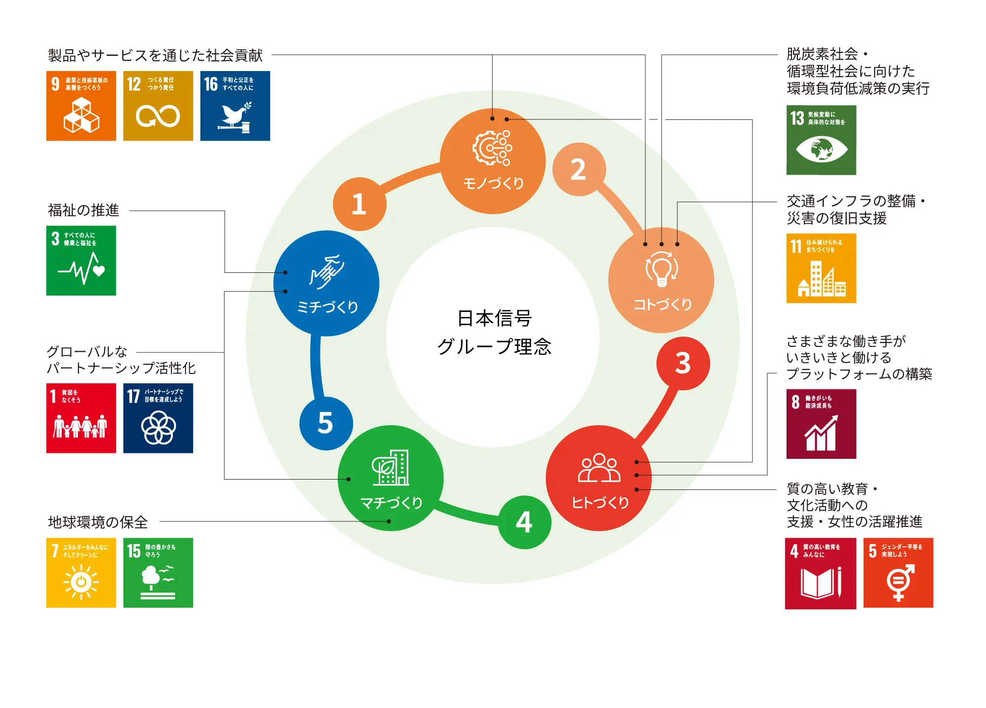 日本信号グループは、SDGsの「世界を変えるための17の目標」とグループ理念を実践する事業活動、